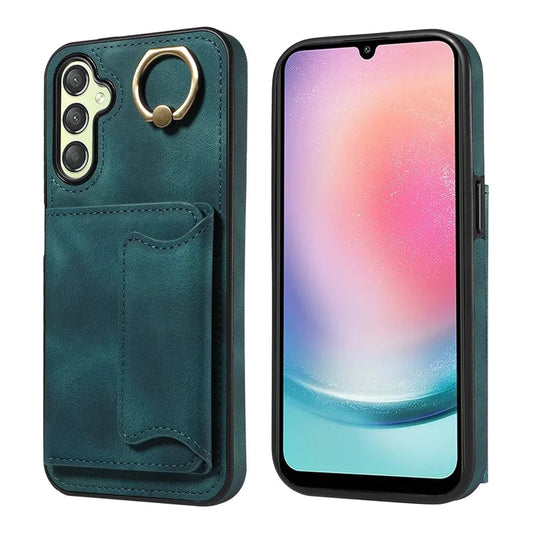 001 For Samsung Galaxy S24 Case Finger Grip Ring Leather Phone Back Cover Card Holder