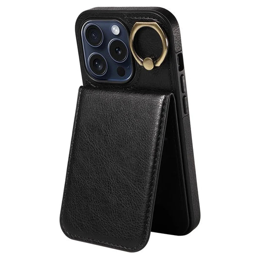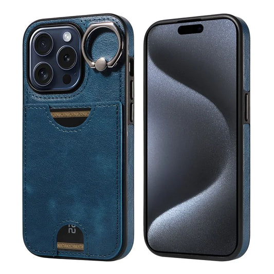 006 For iPhone 15 Pro Case Calf Texture PU TPU Back Cover with Card Slot Ring Grip Holder