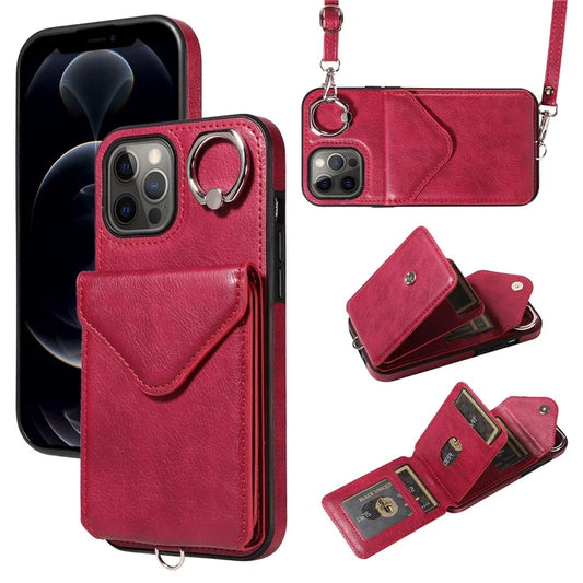 005 For iPhone 12 Pro Max Phone Case Crossbody Strap PU Leather Kickstand Back Cover
