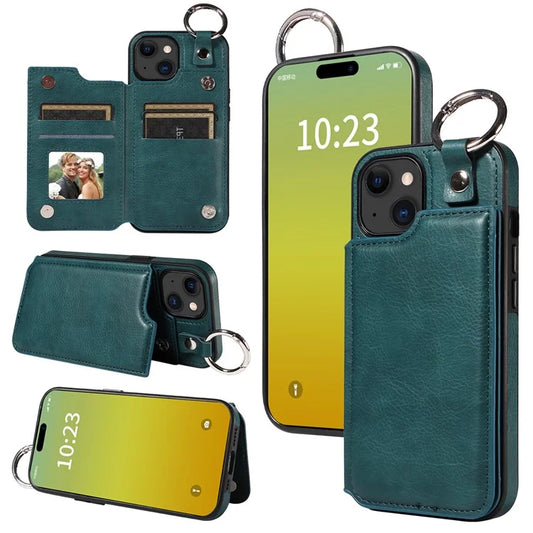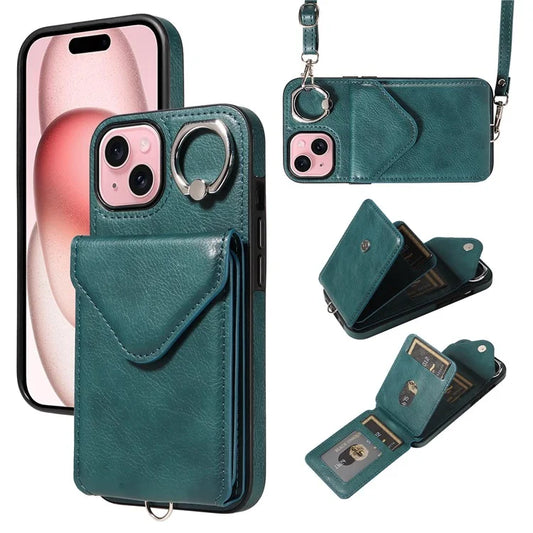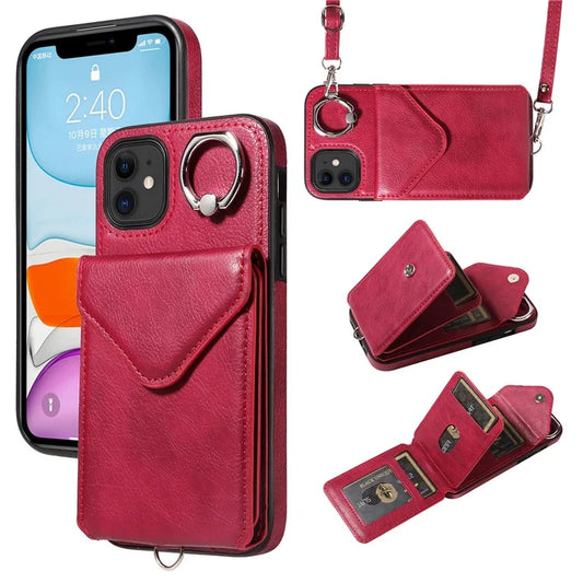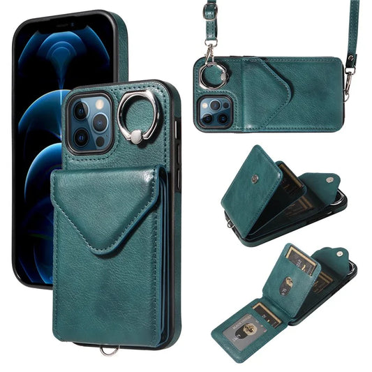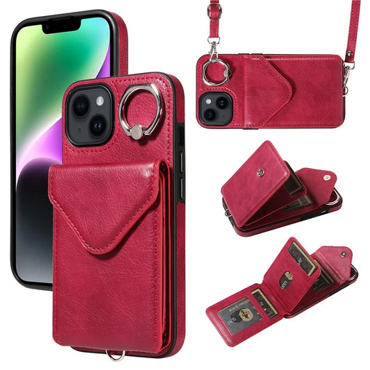 005 For iPhone 13 Crossbody Phone Case PU Leather Ring Grip Shockproof Cover