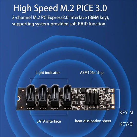 TXB184 Key-M Key-B M.2 NVME Adapter Card PCI-E 3.0 to 4-port SATA3.0 Expansion Card