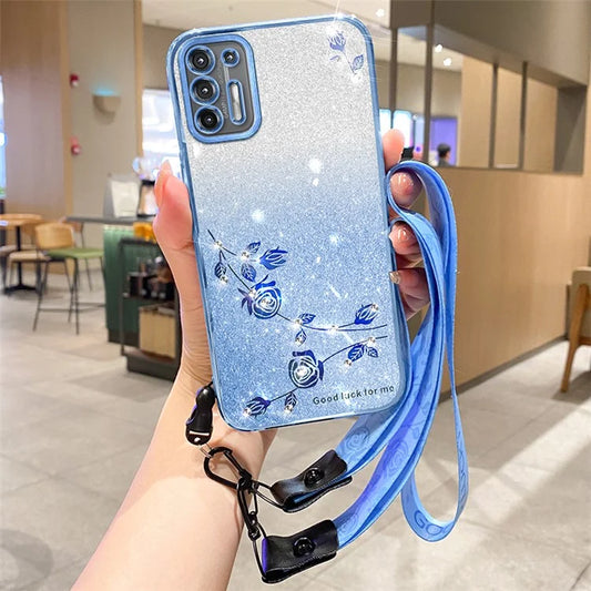 KADEM For Motorola Moto G9 Plus Case Gradient Bling Glitter Rhinestone Flower Phone Cover with Strap