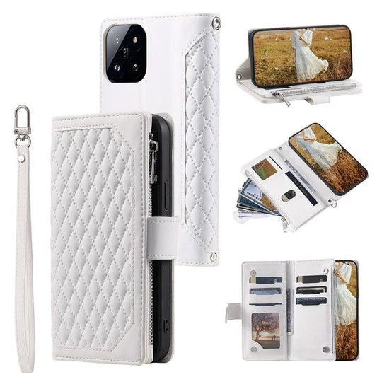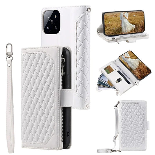005 Style For Xiaomi 14 Case PU Leather Zipper Pocket Rhombus Phone Cover with Strap