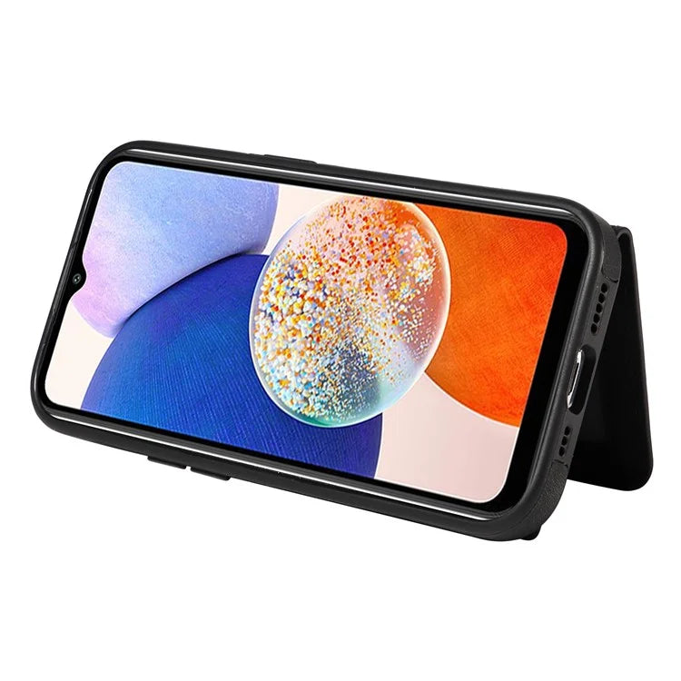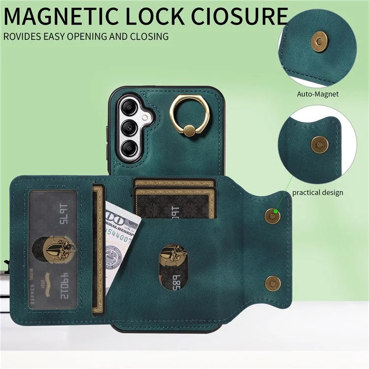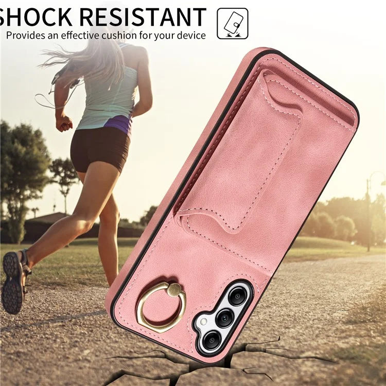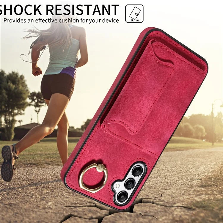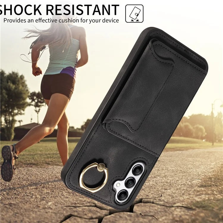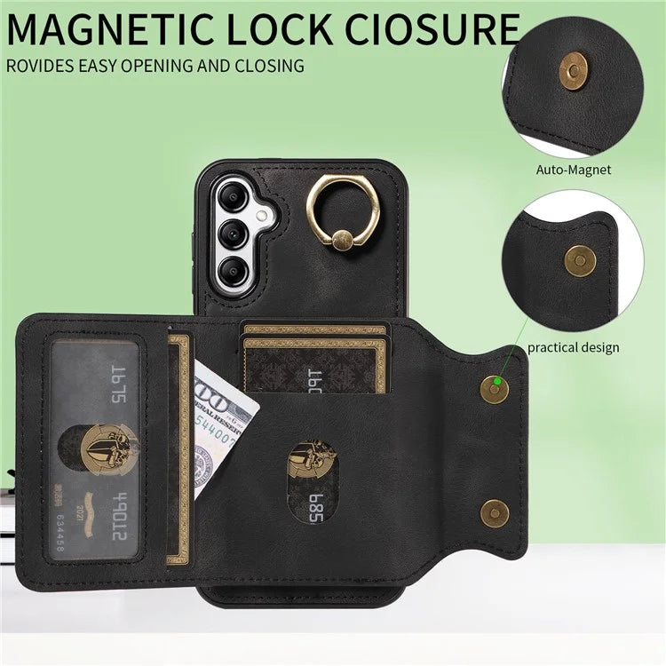 001 For Samsung Galaxy A14 4G / 5G Case Ring Holder Card Slots Anit-Fall Leather Back Cover