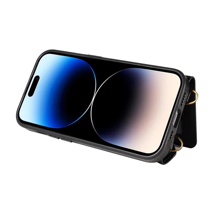 002 For iPhone 15 Pro Case PU Leather Crossbody Phone Cover Card Holder Ring Kickstand
