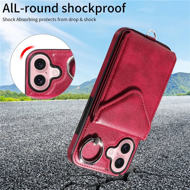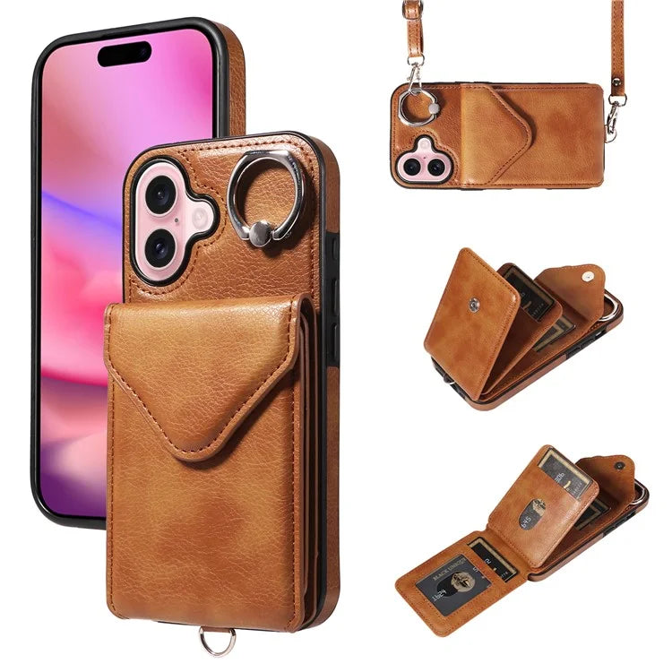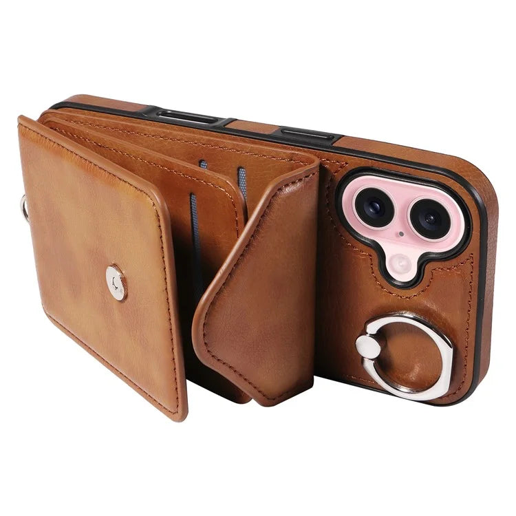 005 For iPhone 16 Case PU Leather Back Cover Card Holder Ring Kickstand