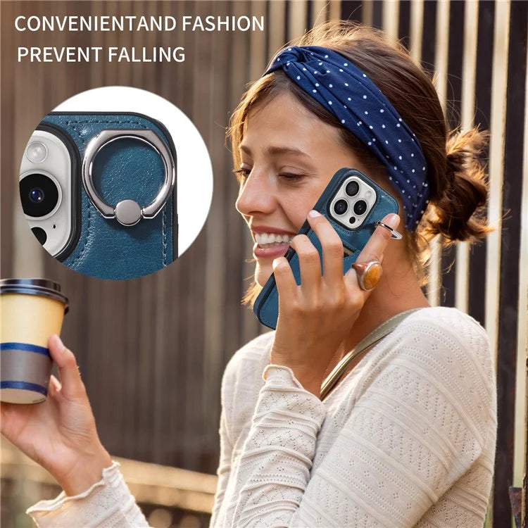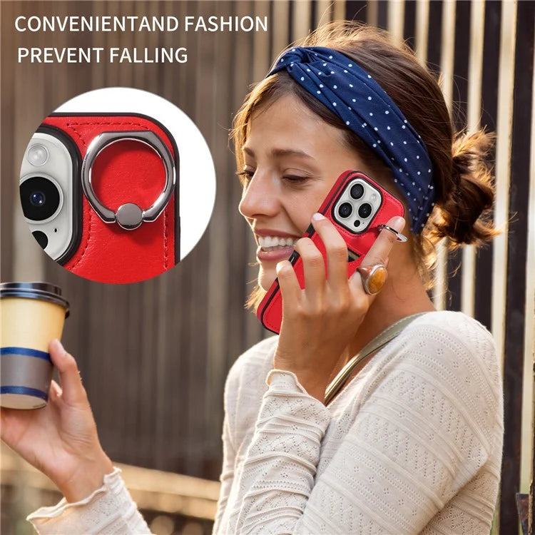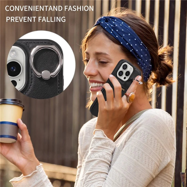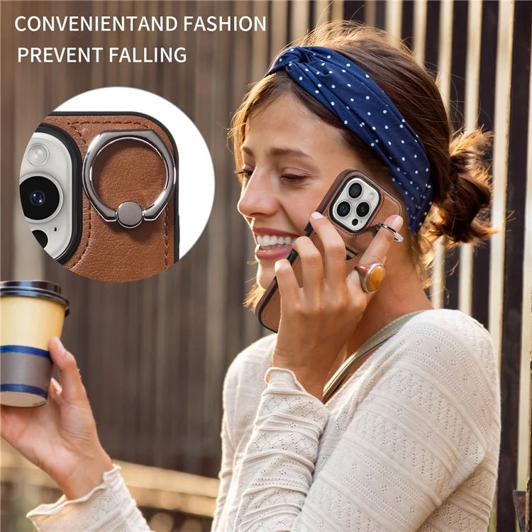 006 For iPhone 16 Pro Case Anti-Drop Leather + TPU Phone Cover Card Slot Ring Kickstand