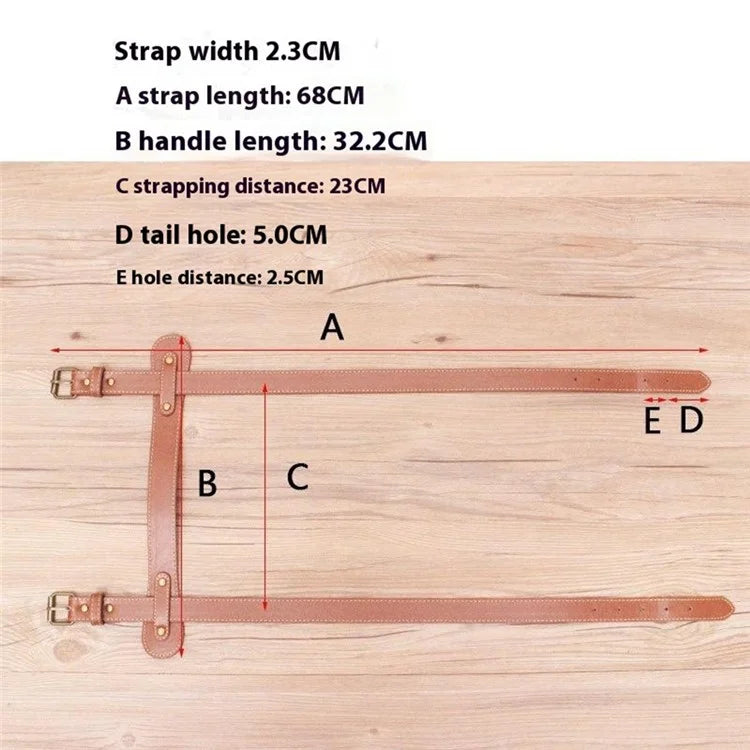 - Size: Width 2.3cm; A length 68cm; B handle length 32.2cm; handle width 4cm; C strap distance 23cm; D tail hole 5m; E hole and D hole distance 2.5cm
