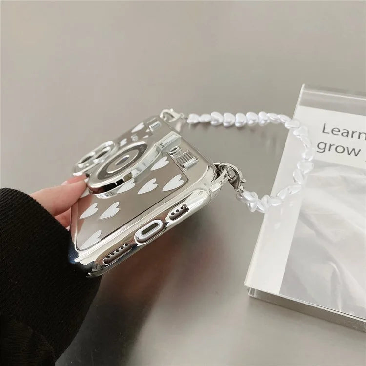Camera Shaped TPU Cover for iPhone 14 Plus Mirror Surface Electroplating Phone Cases with Bead Strap
