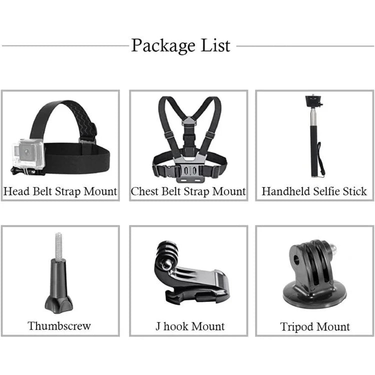 - 6-in-1 Kit: This kit includes essential accessories like a chest strap, head strap, and selfie stick for a complete action camera setup