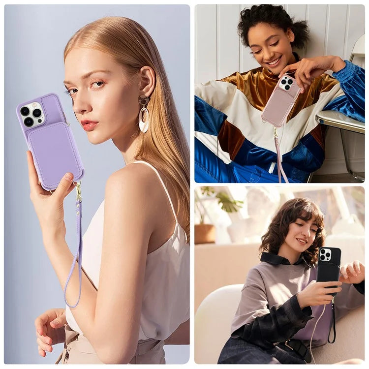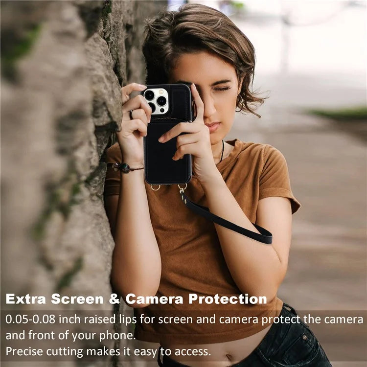 For iPhone 16 Pro Case RFID Blocking Zipper Wallet Leather Phone Cover with Straps