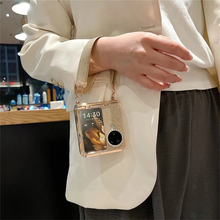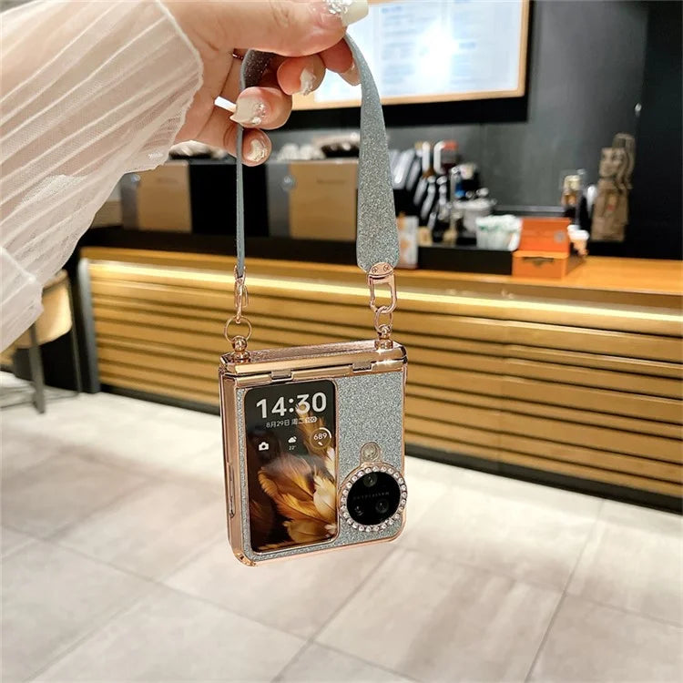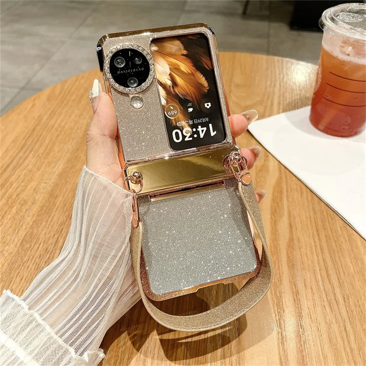 For Oppo Find N3 Flip 5G Case Rhinestones Glitter Hard PC Folding Phone Cover with Wrist Strap